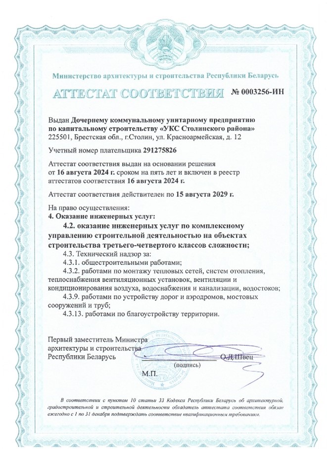 Специалисты предприятия имеют квалификационные аттестаты на различные виды работ и осуществляют свои функции в соответствии с Инструкцией о порядке осуществления технического надзора утвержденной постановлением Министерства архитектуры и строительства Республики Беларусь от 13.09.2024 № 102 «Об осуществлении технического надзора».